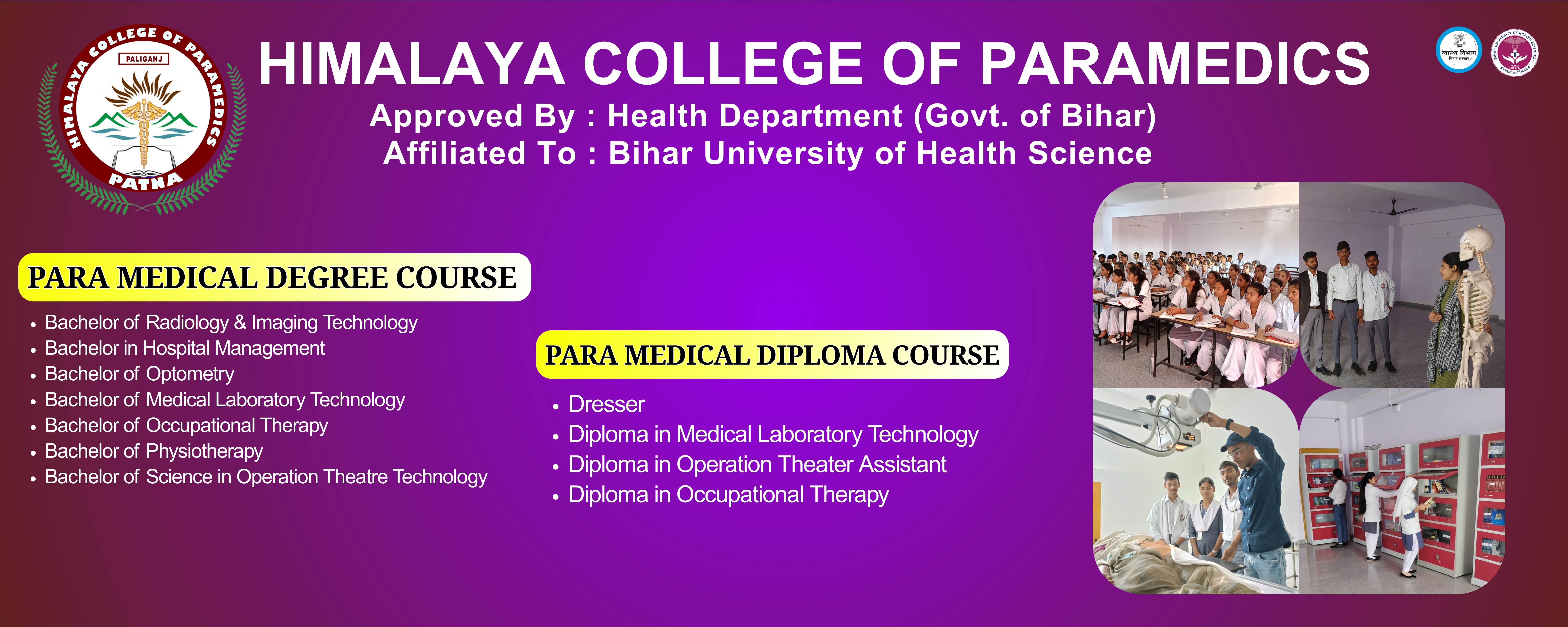The Himalaya College of Paramedics is situated in Paliganj Chiksi district Patna , is a spacious and well equipped with adequate class.